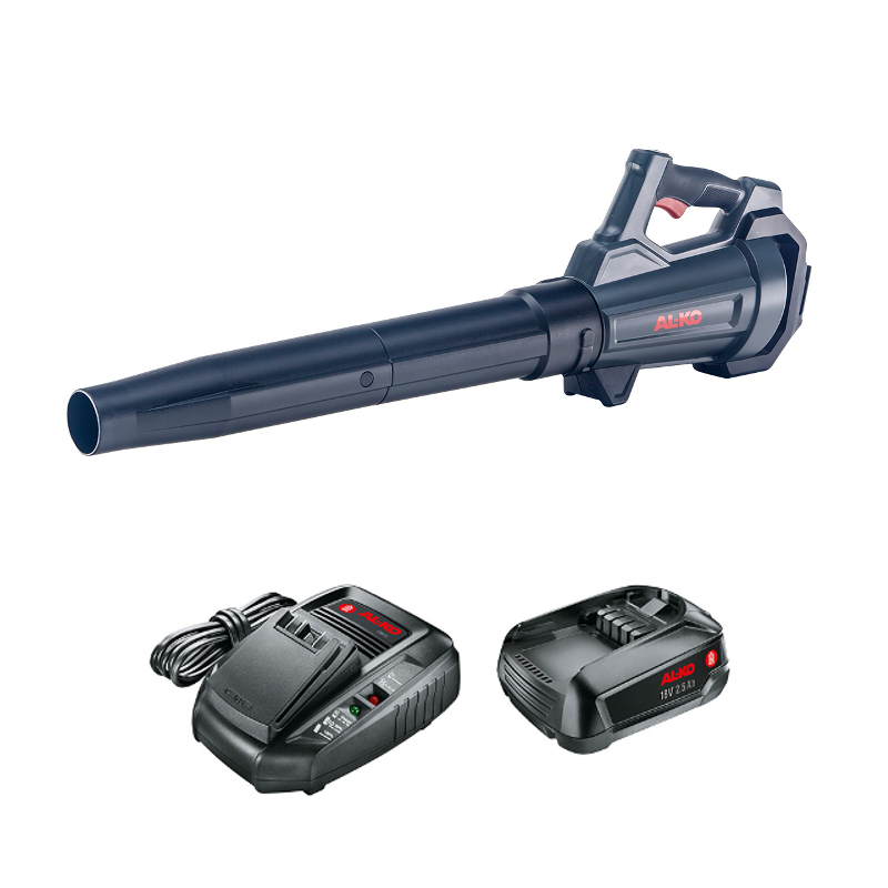 Dmuchawa akumulatorowa AL-KO LB1860 18 V COMFORT w zestawie z akumulatorem Li-lon 18 V (2,5 Ah) i ładowarką.