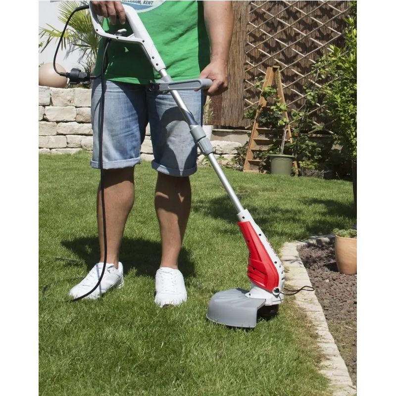 Ikra IGT 350 DA to praktyczna i ergonomiczna podkaszarka elektryczna, stworzona do precyzyjnego przycinania trawy w ogrodzie. Silnik o mocy 350 W oraz szerokość cięcia 25 cm pozwalają sprawnie usuwać trawę przy rabatach, ścieżkach i krawężnikach. Półautomatyczna głowica dwużyłkowa zapewnia płynną pracę, a regulowany uchwyt pomocniczy zwiększa wygodę obsługi. Funkcja obrotu rękojeści o 180° umożliwia cięcie pionowe, dzięki czemu krawędzie trawnika zyskują estetyczne wykończenie. Składany wskaźnik zasięgu żyłki i osłona roślin chronią sąsiednie nasadzenia przed uszkodzeniem.